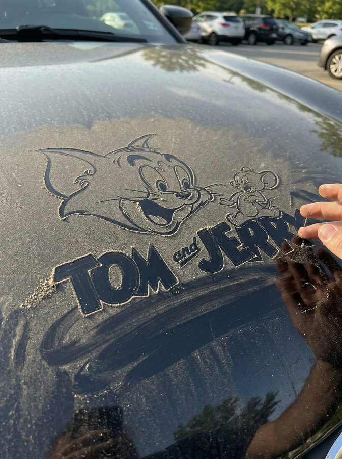 覆盖在汽车引擎盖上的细密灰尘层,厚度不均。