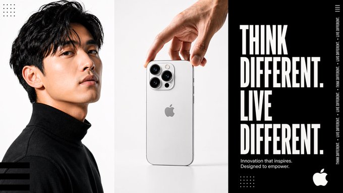 一张为 [BRAND] 制作的专业 16:9 品牌广告海报,分为三个水平面板。左侧面板:一个穿着品牌色服装的人物特写肖像,戏剧性的工作室灯光,直视或稍微偏离镜头的目光。中间面板:品牌产品的英雄镜头,有一只手正在与它互动,干净的品牌主色调背景。右侧面板:纯品牌色背景,带有使用辅助色的超大粗体衬线或紧凑无衬线标题文本,下方是品牌标语的小号文本,右下角是品牌标志,并且标题短语沿着右边缘以极小的文本垂直重复作为设计元素。小几何形状和点阵图案作为装饰点缀。整体美学:高端商业摄影,仅使用两种品牌颜色的严格调色板,具有编辑和电影感。照片级真实。超高清。
