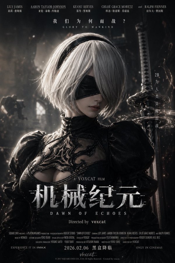 【角色/主题】,奥斯卡级官方电影海报(Official Key Visual),院线商业大片风,电影级布光,暗色高级调色,轻胶片颗粒,动漫角色 cosplay 电影演员,偏真人定妆照质感,随机生成电影名,导演署名voxcat,保留顶部卡司、底部片名与宣传语,自然加入签名voxcat,默认 2:3。