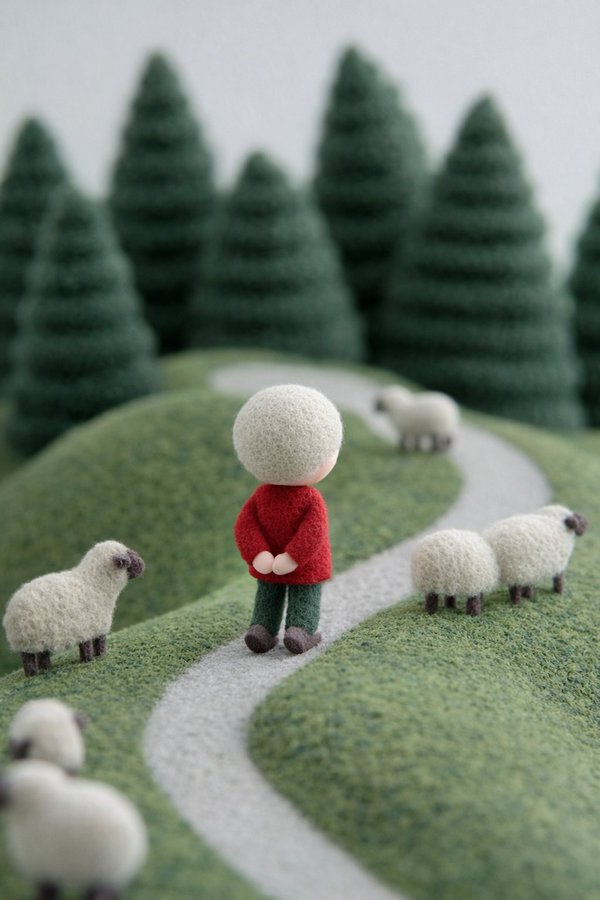 “物种”: “小羊羔” “材质”: “白色毡羊毛” “姿势”:“坐在主角旁边,
