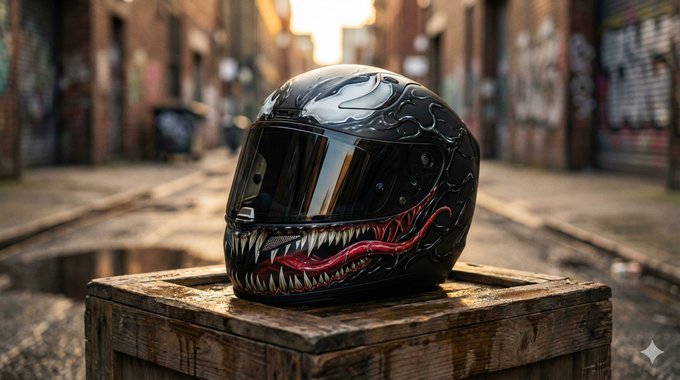 Ultra high-definition professional photography work, [motorcycle helmet] paint effect image, designed in [Venom movie character style].